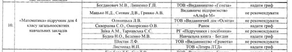 "При зачтении протокола секретарь конкурсной комиссии Елена Дубовик в прямом эфире объявила о том, что конкурсная комиссия предложила предоставить гриф семи из восьми оригинал-макетам учебника "Математика" для 4-го класса общеобразовательных учебных заведений. Однако, в протокол комиссии, подписанный накануне - 26 февраля, включены только четыре учебника", - прокомментировал ситуацию заместитель главного редактора издательства "Підручники і посібники" Сергей Гапьюк.
