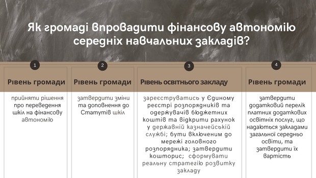 Аби у школи була фінансова автономія, необхідно зробити кілька кроків, які є відповідальністю не тільки адміністрації навчального закладу, а й її засновника та територіальної громади.