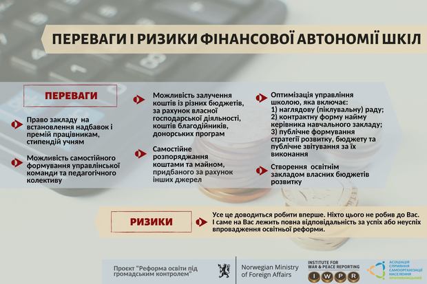 Ежегодно образовательная отрасль получает из государственного бюджета финансирование меньше, чем запланировано. О том, что средств на образование не хватает, свидетельствуют многочисленные публикации в СМИ, среди которых ряд обращений от ИГС «Ассоциация городов Украины» и Профсоюза работников образования и науки Украины. Учитывая, что расходная часть бюджета Украины больше, чем доходная (данные Минфина), а падение реального ВВП Украины в 2020 году ожидается на уровне 5,9%, такая же тенденция будет наблюдаться и в дальнейшем. Поэтому образовательные учреждения постоянно испытывают потребность в поиске возможностей для привлечения ресурсов из разных источников. Законодательство Украины дает школам достаточно возможностей для этого. Одной из них является внедрение финансовой автономии школ, которая является абсолютно новой деятельностью для общин и администраций школ.