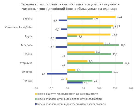 А те, що саме відчуття учнями своєї приналежності до закладу освіти неабияк впливає на успішність – підтверджений об’єктивними даними факт. У цьому можна переконатися, звернувшись до п’ятого числа матеріалів «PISA-2018: Україна в центрі уваги», де показано: з-поміж кількох взаємопов’язаних чинників, що стосуються атмосфери в закладі освіти, на успішність українських учнів найпотужніше впливає відчуття ними своєї приналежності до школи (див. рисунок).