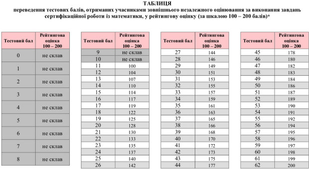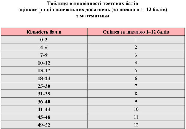 Поскольку результаты внешнего оценивания по математике могут быть засчитаны как государственная итоговая аттестация за школьный курс по математике, Украинским центром оценивания качества образования составлена и утверждена отдельная таблица перевода тестовых баллов в шкалу 1-12 баллов.