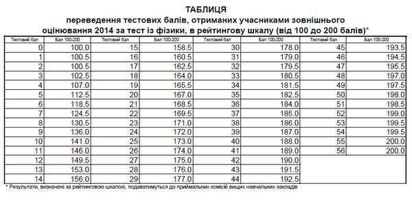 По результатам тестирования Украинским центром оценивания качества образования опубликована таблица перевода тестовых баллов, полученных участниками внешнего независимого оценивания за тест по физике в 2014 году, в рейтинговую шкалу (100-200 баллов).