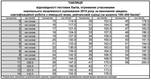 По результатам тестирования Украинским центром оценивания качества образования обнародована таблица перевода тестовых баллов, полученных участниками внешнего независимого оценивания за тест по немецкому языку в 2015 году, в рейтинговую шкалу (100-200 баллов).