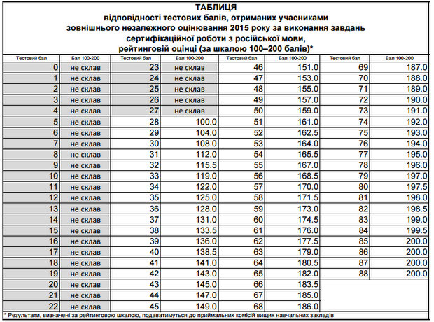 По результатам тестирования Украинским центром оценивания качества образования обнародована таблица перевода тестовых баллов, полученных участниками внешнего независимого оценивания за тест по русскому языку в 2015 году, в рейтинговую шкалу (100-200 баллов).