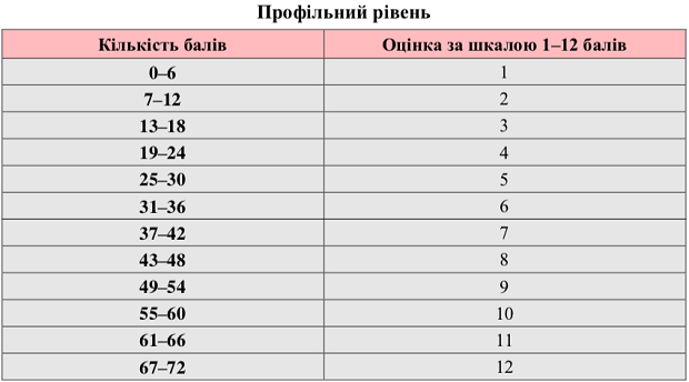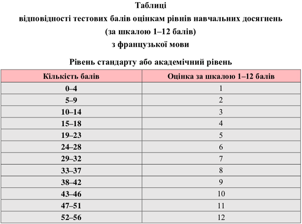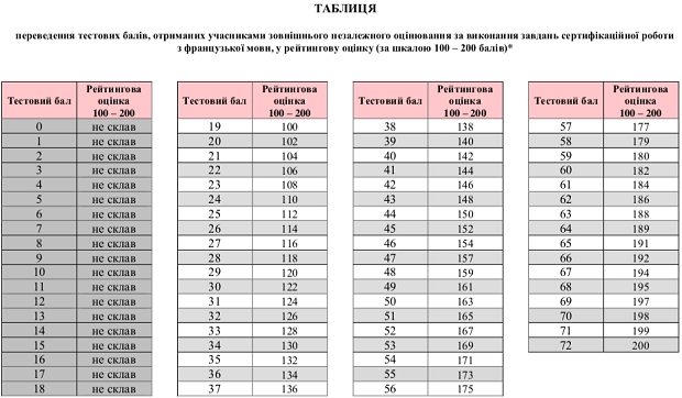 Также Украинским центром оценивания качества образования опубликована таблица перевода тестовых баллов, полученных участниками внешнего независимого оценивания за тест по французскому языку в 2019 году, в шкалу 1-12 баллов.
