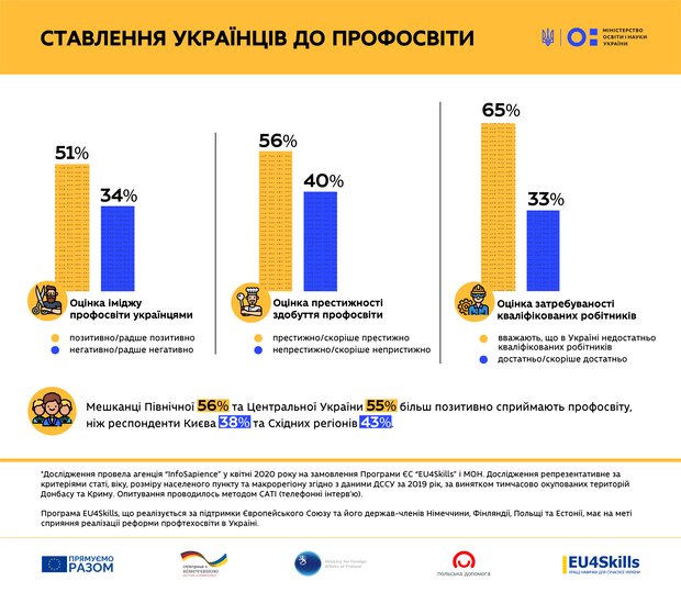 Большинство украинцев считают, что иметь профессиональное образование престижно и пока стране не хватает квалифицированных рабочих. В то же время 66% учащихся профтехов отмечают, что им нравится обучение.