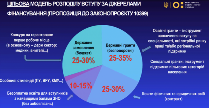 Согласно предложенной МОН модели финансирования получения высшего образования государственным заказом должно быть охвачено 25-30% первокурсников, которые будут участвовать в конкурсе на гарантированное первое рабочее место (в основном государственный сектор: медики, учителя и т. п.).