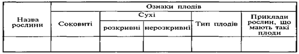 Під керівництвом учителя, користуючись підручником, таблицями, колекціями, визначте типи плодів. Одержані результати занесіть до табл. 3.