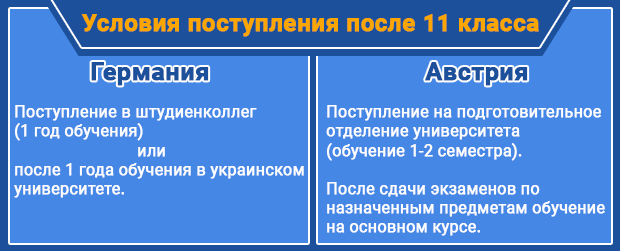 Система среднего образования в Европе имеет свои особенности. Обучение в Германии, как и в Австрии, в средней школе длится 12 лет, в Украине – 11. Соответственно, выпускники украинских школ не могут быть зачислены напрямую в университет, разницу в школьном образовании нужно перекрыть – это первое требование при поступлении.