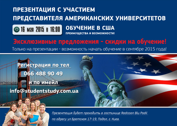 Тогда вы можете посетить бесплатный семинар-презентацию, где сможете получить исчерпывающую информацию о всех доступных возможностях обучения в США, начиная от обучения в средней школе и заканчивая университетским и последипломным образованием.