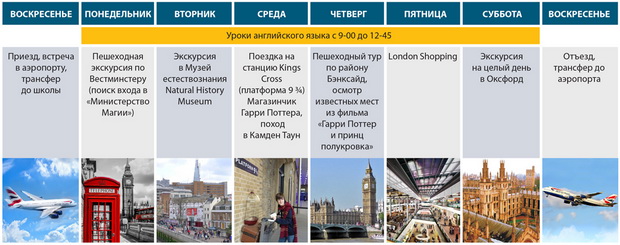 Экскурсии. Уроки проходят в первой половине дня и заканчиваются в 12:45. Таким образом, после сытного и вкусного обеда вторая половина дня посвящена исключительно экскурсиям и развлечениям. Каждый день, ребят ждет экскурсия по местам, тем или иным образом связанным с известным волшебником: в Вестминстере они поищут вход в Министерство Магии, отправятся на станцию Kings Cross, чтобы разгадать секрет заколдованной платформы 9 ¾, прогуляются по местам из фильма «Гарри Поттер и принц полукровка», съездят в Оксфорд и сходят в знаменитый музей естествознания.
