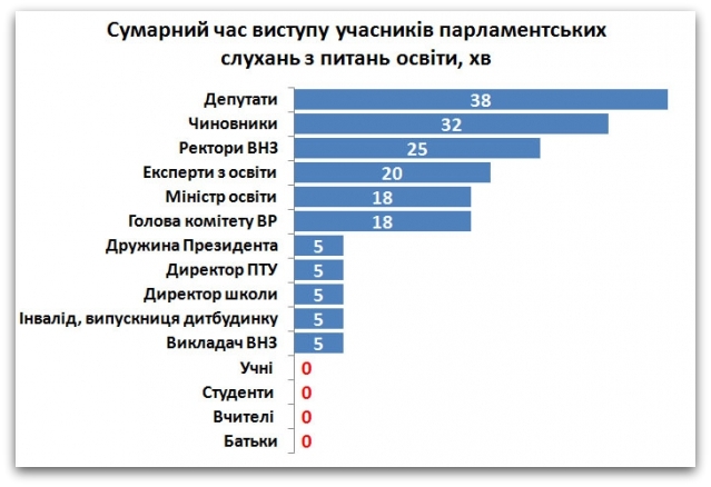 Статистика — невблагана річ: левову частину часу виступів (70 хвилин з 180) забрали спічі депутатів та чиновників, які й так мають безліч можливостей висловити свою думку під час безкінечної балаканини у міністерствах та комітетах.