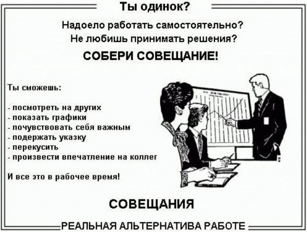 Люди мають збирались, щоб порадитись, а не для того, щоб вислухати монологи начальників, заздалегідь сплановані виступи від «народу»(як правило, в стилі «одобрямс» або в стилі «розривання сорочки на тілі» для удаваної демократичності). Немає сенсу збирати людей заради передавання їм якоїсь інформації, яку запросто можна було б надіслати на електронну пошту. Звісно, в умовах, коли «партія вела» наради вимушено були формальним «партхозактивом», а не знаряддям генерування колективного рішення. Зараз вони стали «бессмысленной и беспощадной» відрижкою «совка», своєрідним бюрократичним ритуалом заради ритуалу і заради галочки в звіті «про пророблену роботу», яка заміняє власне реальну роботу.