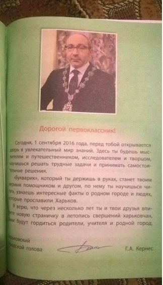 З першого вересня по Фейсбуку гуляє портрет мера Харкова Кернеса зі шкільного "Букваря", який чомусь називається «Букварик харковского школьника». Сам портрет - це окрема тема досліджень для психіатрів. Бажання відокремити харківських школярів від усіх інших українських школярів - це питання до СБУ. Але суть не у портреті й навіть не в особі, яка на ньому зображена.