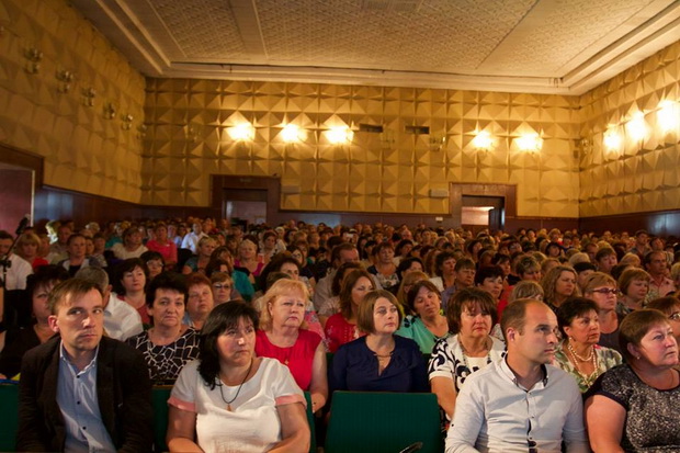 Та велика - більше ніж на 550 осіб у Великомихайлівці з освітянами Захарівського, Великомихайлівського,Роздільнянського, Окнянського, Іванівського, Ананьївського та Подільського районів. Мені сказали, що вчителі ще з одного району приїхали з власної ініціативи та без попередження, і тому їм довелося сидіти на додаткових стільчиках у проході, але я, на жаль, забула уточнити з якого.