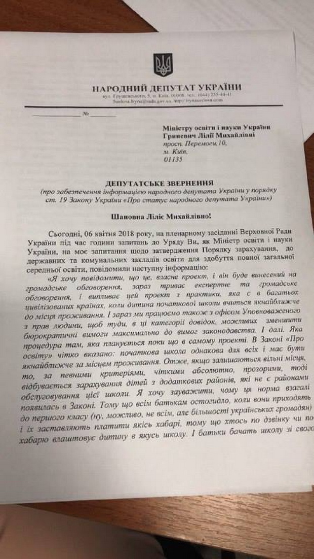 Сьогодні під час години запитань до Уряду хотіла дізнатись у Міністра освіти та науки, чому МОН наполегливо просуває ідею зарахування дітей до школи на основі реєстрації або за наявністю нотаріально завіреного договору оренди житла.