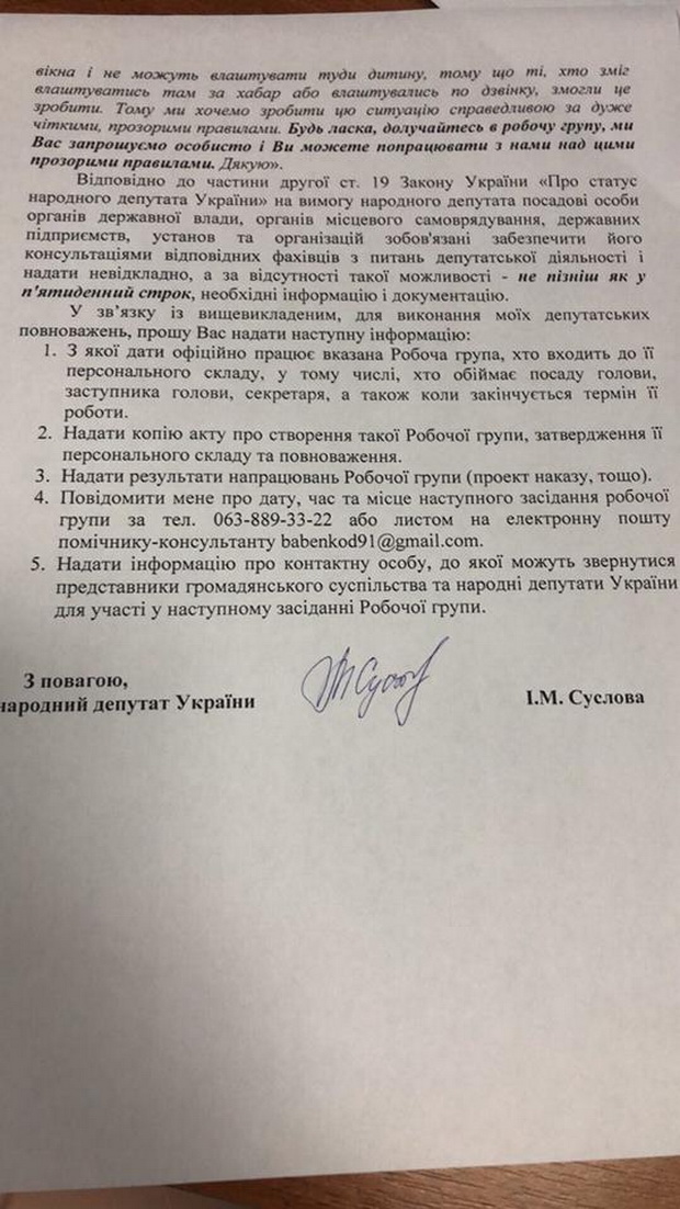 Тому спрямувала депутатське звернення до Лілії Гриневич з проханням надати офіційне роз’яснення, з якого часу працює Робоча група, хто до неї входить та які в неї є напрацювання. Відповідно до діючого законодавства, очікую на відповідь протягом п’яти днів!