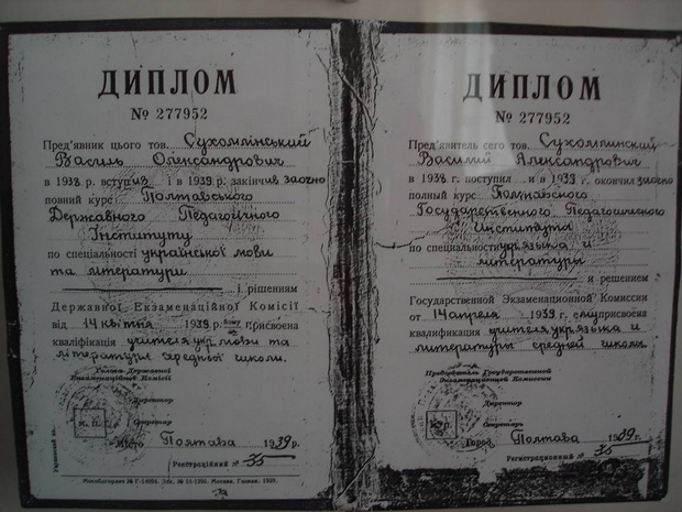 У такій квартирі в далекому 1948 році і поселився зі своєю сім’єю Василь Олександрович Сухомлинський. Школу, куди його було призначено директором, вибрав продумано. По-перше, учительська квартира; по-друге, – залізнична станція Павлиш, яка давала змогу зв’язуватися із великим світом; по-третє, до села Василівка, де народився, закінчив семирічку і де сімнадцятирічним почав працювати вчителем, було рукою подати… Та була ще одна суто побутова дрібниця, яка, думається, особливо влаштовувала молодого керівника школи: в директорський кабінет можна було зайти просто з квартири, а, точніше, з вітальні, яка з часом перестала нагадувати вітальню, бо її високі стіни від підлоги до стелі вщент заповнилися книжками. Для них були спеціально замовлені стелажі та ще й драбинка, щоб з її допомогою можна було дістатися до верхніх полиць. Другі двері з цього кабінету вели у шкільне фойє. Виходить, що кабінет одночасно був і «квартирним», і службовим, директорським. Скажете, дрібниця, не варта уваги… Та ні, все набагато складніше, бо засвідчує з якоюсь особливою красномовністю, що для нього фактично не існувало межі між особистим життям і життям школи. Йдеться про абсолютну відданість справі та про виключно високий рівень самоорганізації. Проте слово «фанатизм» тут не підходить. Потрібні інші слова – вищі, шляхетніші, врешті-решт, точніші.