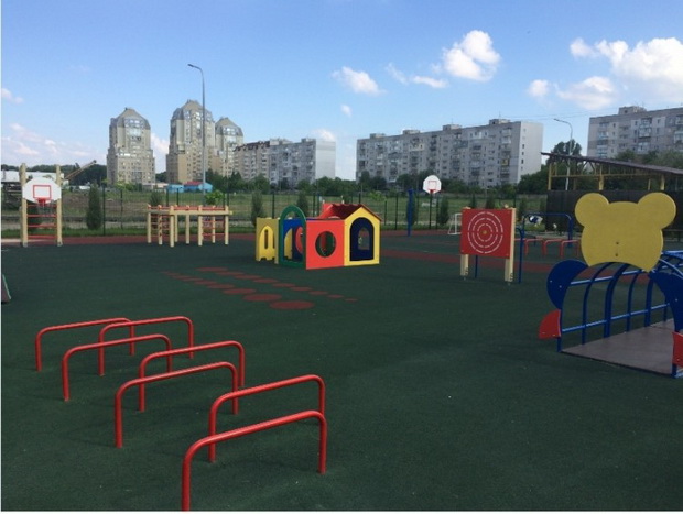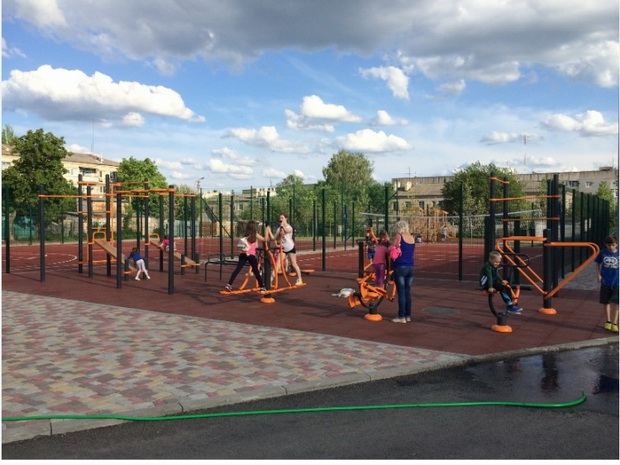 А це їхні спортивні майданчики: тренажерний, баскетбольний та волейбольний. Всюди гумове покриття. Плюс два футбольних поля - стандартне та для міні-футболу. З штучним ворсистим газоном, дуже приємним на дотик. Бігові доріжки - гумові. Гумове покриття навіть у спортзалі, що знаходиться в самому приміщенні школи.