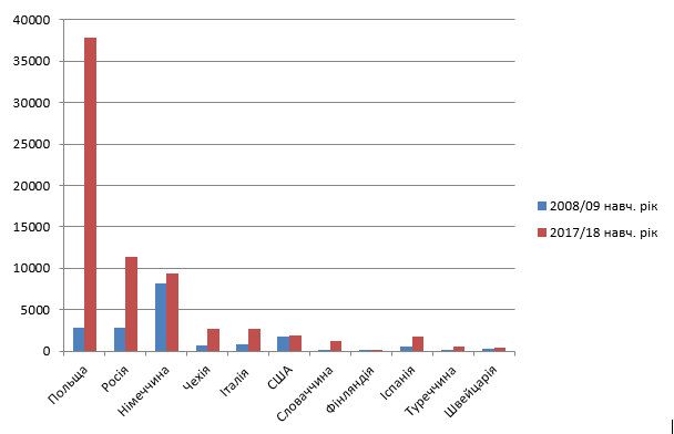 За даними аналітичного центру CEDOS, вже в 2016/17 навчальному році було 77424 особи з українським громадянством, які навчались в закордонних університетах, тобто більш ніж 8% всіх українців, що вчаться на денних програмах в закладах вищої освіти. Причому за останні десять років їх кількість зросла втричі. Найчастіше для навчання українці зараз, так само, як і десять років тому, обирають Польщу, Росію, Німеччину, Канаду, Чехію, Італію, США, Іспанію, Словаччину.