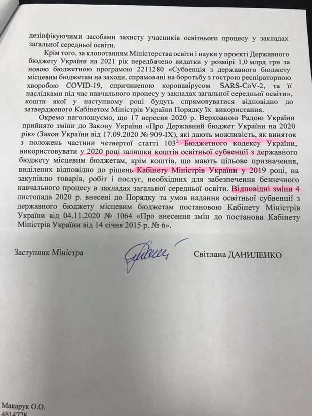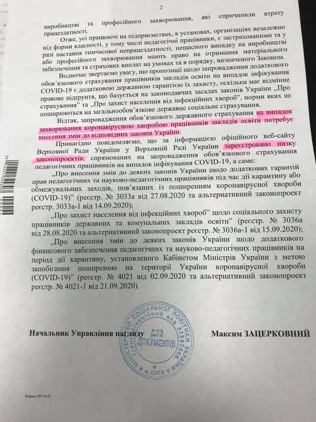 По-перше, як завжди, ми чуємо, що зареєстровані законопроекти чекають розгляду у Верховній Раді України. Чому подбати про людей не можна було з 12 березня 2020 року? Натомість ВР приймає набагато «важливіші» рішення, ніш захист учасників освітнього процесу. У листі було подано низку законопроектів, які, на думку МОН, допоможуть захистити працівників освіти. МОН вважає, що не потрібно вносити зміни до ст. 39 Закону України «Про захист населення від інфекційних хвороб».