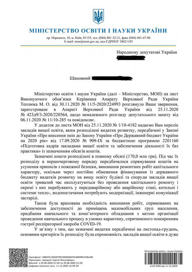 Як можна побачити з документа, розподіл, м’яко кажучи, нерівномірний. Окремі ЗВО отримали непропорційно великі суми у порівнянні з іншими. Як вказується в листі МОН від 11.12.2020 № 1/10-4484, адресованому одному з народних депутатів, «основним критерієм ... розподілу була спроможність закладів вищої освіти в дуже стислі терміни, що залишилися до кінця року, провести тендери і в повному обсязі використати виділені кошти».