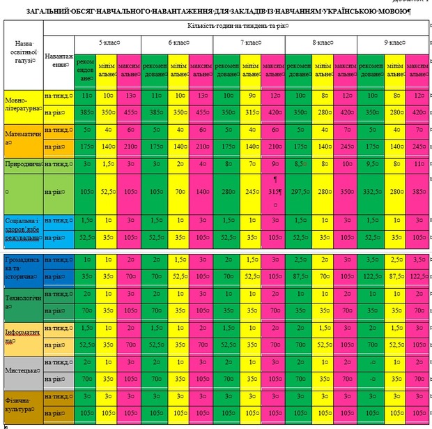 На моє особисте переконання, існування в базовій школі предметів з тижневим навантаженням 0,5–1,5 год — це профанація, яка точно не на користь дітям. Ці предмети мали б стати змістовою лінією якогось загального предмета/предметів. І тоді, наприклад у 5-му класі, за умови передбачуваного граничного навантаження у 27 год, ішлося б про середнє тижневе навантаження на один предмет у 3 год (якщо врахувати, що є такі предмети, як мова чи математика, на які відведено 4–5 год). Із цього виходило б, що учень 5-го класу мав би у своєму розкладі не більше ніж 9 предметів, а до 9-го класу їхня кількість поступово зросла б приблизно до 12 предметів. Це цілком прийнятне навантаження, яке б дозволяло не розсіювати увагу учня, що в сучасному потоковому інформаційному просторі є надважливим.