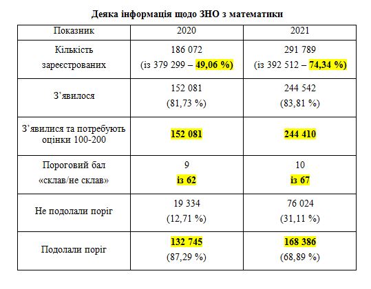 Поріг «слав / не склав» цього року подолало на 34 тисячі осіб більше, ніж минулого. До вишів можуть подати результати з математики 2021 року значно більша кількість абітурієнтів, ніж минулого, при приблизно однаковій кількості абітурієнтів у 2020 та 2021 роках.