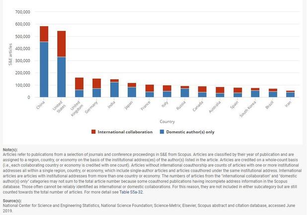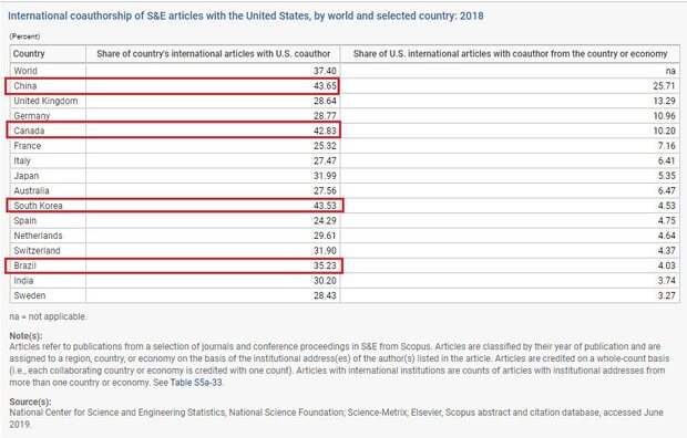 Учені з Китаю, Південної Кореї, Канади та Бразилії є найбільш активними у формуванні науково-публікаційних авторських колективів з вченими з США. 43,65%, 43,53%, 42,83% та 35,23% – саме така частка наукових публікацій авторів з цих країн з авторами з США у загальній кількості міжнародних публікацій авторів з цих країн.