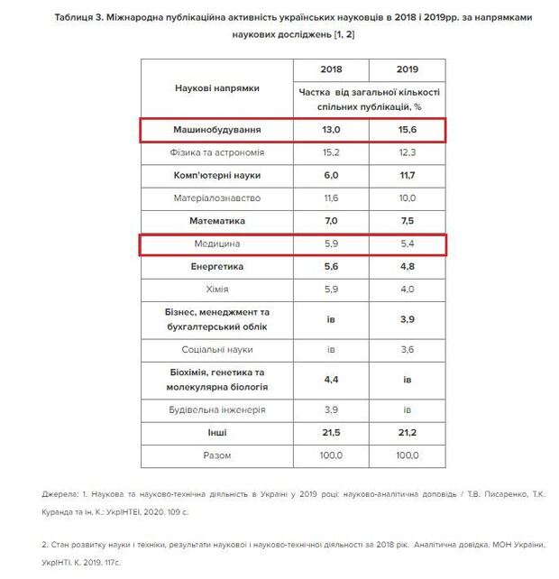 Варто звернути увагу на частку міжнародних публікацій українських авторів з медицини (лише 5,4%), що значно поступається машинобудуванню, фізиці й астрономії та іншим. Це викликає запитання, тому що саме медицина є найбільш популярною спеціальністю серед іноземних студентів (разом з двома іншими спорідненими спеціальностями медицина концентрує майже 50% ринку послуг вищої освіти для іноземних студентів в Україні), а нові, унікальні знання є результатом саме наукових досліджень, апробованих також і на рівні публікацій. Саме тут виникають похідні питання: «Що насправді формує мотивацію іноземних студентів вчитися саме на такій спеціальності? Чи не створює такий дисбаланс між обсягом генерованих ученими унікальних знань, що мають бути включені до освітньої програми, та попитом на відповідну спеціальність іноземних студентів, ризики втрати змістовної якості освітньої програми, як конкурентної переваги на міжнародному ринку?»