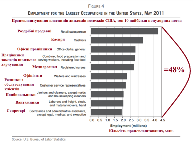 48% – це показник інфляції дипломів про вищу освіту у США, тобто саме така частка випускників-бакалаврів коледжів США працюють на посадах, які не потребують диплому про вищу освіту взагалі.