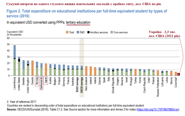 Варто зазначити, що такі країни, які Нідерланди, Норвегія, Фінляндія, Німеччина також мають одні з найбільших витрат на одного студента – близько 20 тисяч доларів США на рік. Це свідчить про те, що якісне охоплення вищою освітою населення можливо лише за умови достатнього фінансування, у даному випадку у розрахунку на одного студента.
