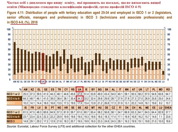 Аналогічний показник в Україні за період з 2010 по 2018 роки зріс з 30% до 34,3%, і хоча наш показник розраховувався для випускників як магістратури, так і бакалаврату, що, можливо, робить його заниженим, але 48% випускників бакалаврату коледжів США, працевлаштованих там, де вища освіта непотрібна – цифра достатньо шокуюча.