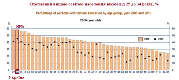 Частка дітей, охоплених дошкільною освітою (закладами дошкільної освіти) в Україні складає 58% (2020 рік). При цьому показник охоплення вищою освітою населення України вікової групи 20–34 роки складає також 58%.
