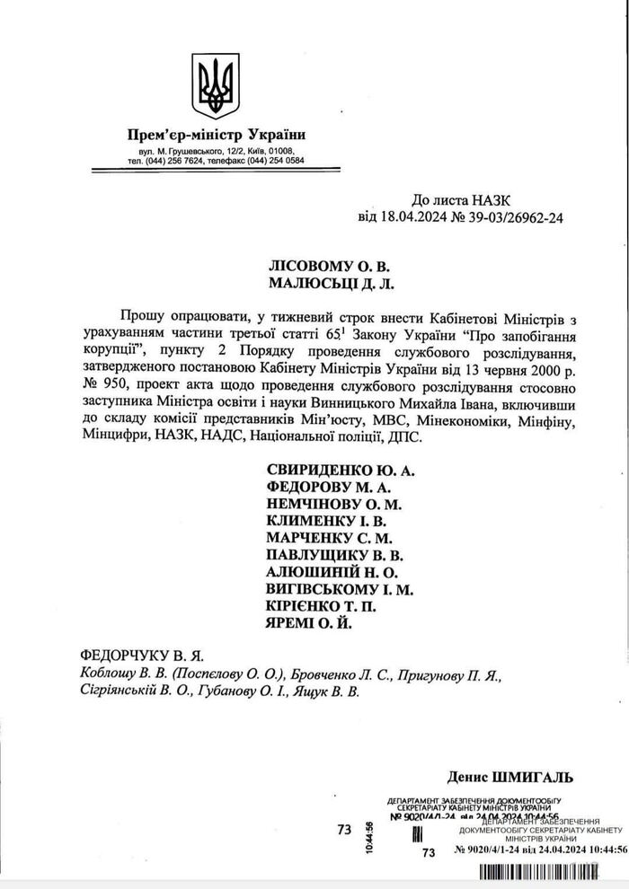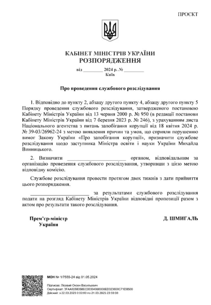 2. Прем'єр-міністр дав доручення міністру освіти і науки України підготувати проєкт розпорядження про проведення службового розслідування.