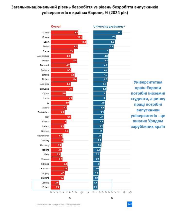 В усіх інших країнах рівень безробіття випускників університетів нижчий загального рівня безробіття в економіці. Для університетів країн Європи та їх абітурієнтів це добра новина.