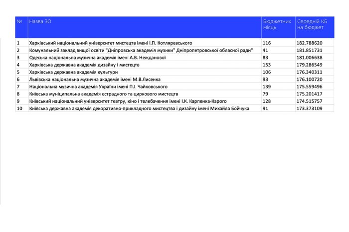 Середній конкурсний бал мистецьких ЗВО (вказаний на картинці) розраховано так само, як і для інших університетів: береться кожна освітня програма, на яку було зараховано студентів за державним замовленням, і виводиться середнє значення конкурсного балу. Якщо три програми – три значення, якщо тридцять три – усі тридцять три.