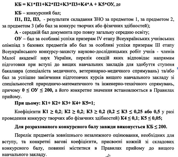 Конкурсный балл вычисляется как сумма баллов за каждый сертификат, средний балл документа о полном общем среднем образовании, балл за конкурс творческих или физических способностей (в случае его проведения), за особые успехи (призерам IV этапа Всеукраинских ученических олимпиад по базовым предметам; призерам III этапа всеукраинского конкурса-защиты научно-исследовательских работ учеников - членов Малой академии наук Украины) и / или за успешное окончание подготовительных курсов вуза для поступления в этот вуз на естественно-математические и инженерно-технические специальности, умноженная на весовые коэффициенты, которые устанавливаются Правилами приема в высшие учебные заведения. Сумма коэффициентов должна равняться единице.