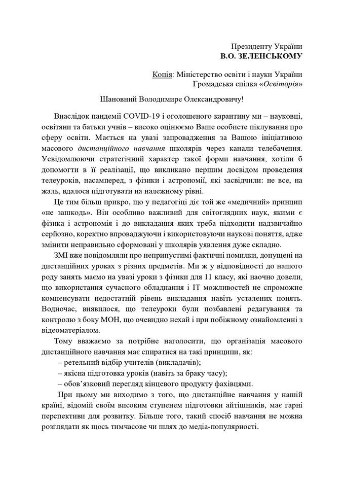 Более двух десятков украинских ученых, представляющих научные учреждения НАН Украины, некоторые университеты и украинские школы, пожаловались Президенту Украины на ненадлежащий уровень подготовки телеуроков проекта «Всеукраинская школа онлайн». Также подписанты отмечают, что «выход учителей из класса» демонстрирует низкий уровень их профессиональной подготовки.