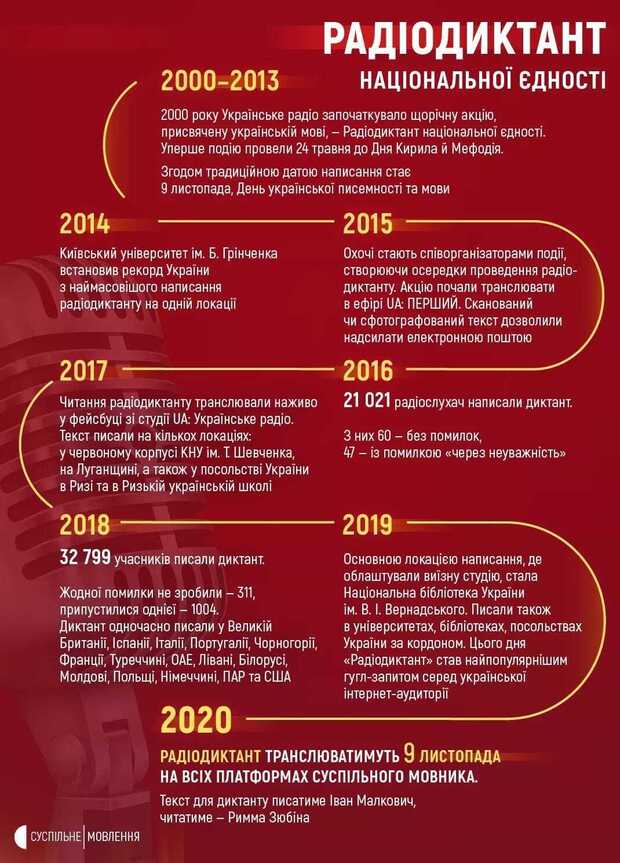 Двадцять років тому Українське радіо започаткувало щорічну акцію, присвячену українській мові, — Радіодиктант національної єдності. Уперше подію провели 24 травня 2000 року до Дня Кирила й Мефодія. Згодом традиційною датою написання радіодиктанту стало 9 листопада, День української писемності та мови.