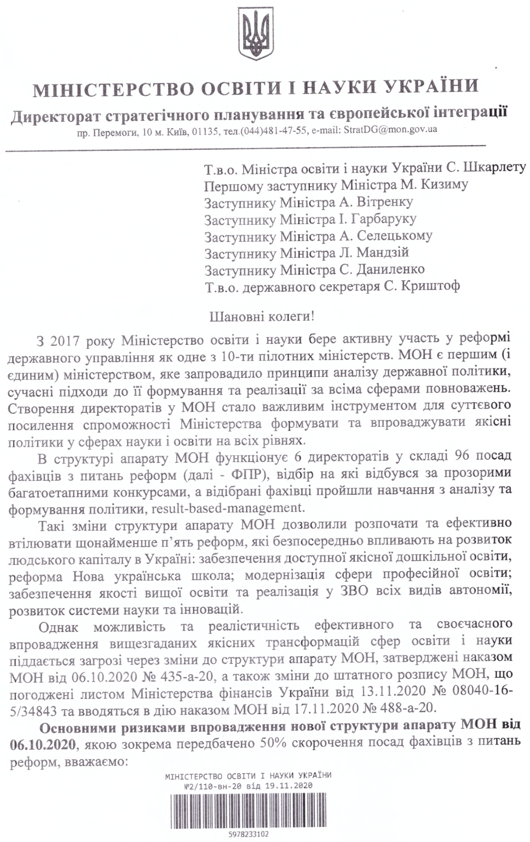 Также авторы обращения акцентируют внимание руководства МОН на том, что внедрение новой структуры аппарата может привести к недостаточной способности министерства для развертывания новых задекларированных трансформаций, нехватке коммуникации со стейкхолдерами различных сфер, сокращению или потере доверия к системе образования и правительственным решениям, невозможности быстро и качественно реагировать на вызовы, нехватке способности для своевременного и качественного выполнения Программы деятельности Кабинета Министров Украины и др.
