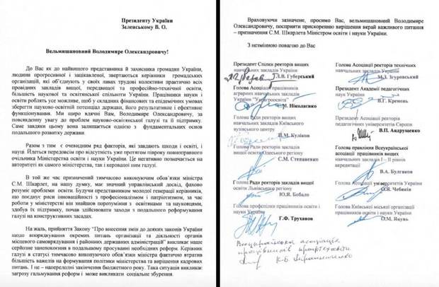 Письмо подписано президентом Союза ректоров высших учебных заведений Леонидом Губерским, главой Ассоциации ректоров технических учебных заведений Михаилом Згруровским, главой Ассоциации представителей аграрных учебных заведений Станиславом Николаенко, президентом Академии педагогических наук Василием Кременем, главой Совета ректоров высших учебных заведений киевского вузовского центра Петром Куликовым, президентом Ассоциации ректоров педагогических университетов Европы Виктором Андрущенко, главой Совета ректоров высших учебных заведений одесского региона Сергеем Степаненко, главой правления Всеукраинской ассоциации работников высших учебных заведений I-II уровней аккредитации Валерием Булгаковым, главой Совета ректоров высших учебных заведений львовского региона Юрием Бобало, главой ассоциации университетов Украины Алексеем Чебыкиным, главой Профсоюза работников образования и науки Георгием Трухановым, главой Киевской городской организации работников образования и науки Александром Яцунем.