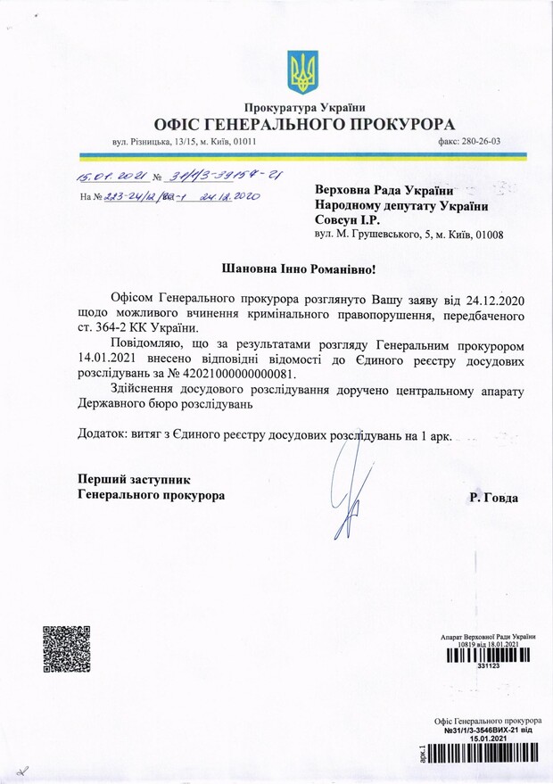 Об этом в своем Facebook сообщила народный депутат Инна Совсун со ссылкой на решение Генерального прокурора Украины.