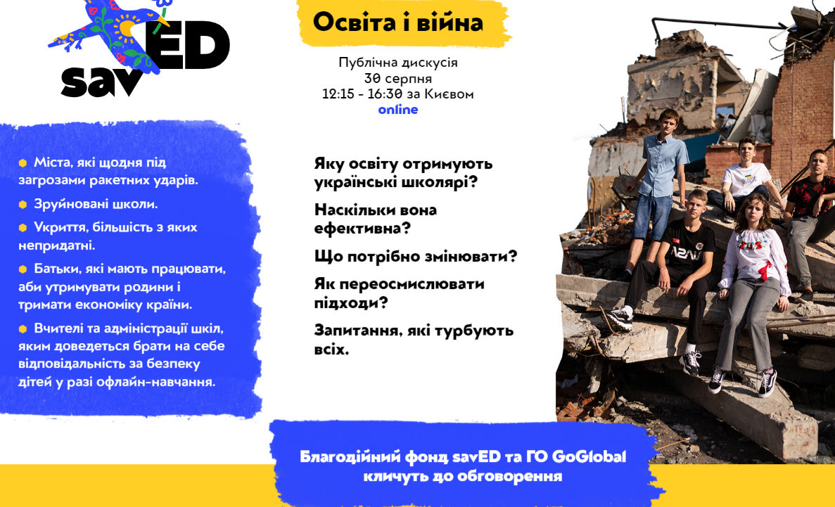 В ходе дискуссии состоится презентация благотворительного фонда savED, целью которого является восстановление образовательной инфраструктуры Украины и возвращение детям права на образование.
