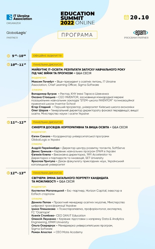 В ходе саммита запланировано проведение 5 панельных дискуссий по темам будущего ИТ-образования, синергии корпоративного и высшего образования, свитчерства, повышения качества, сохранения ИТ-потенциала на разных уровнях, а также доклад о силе и устойчивости украинского ИТ.