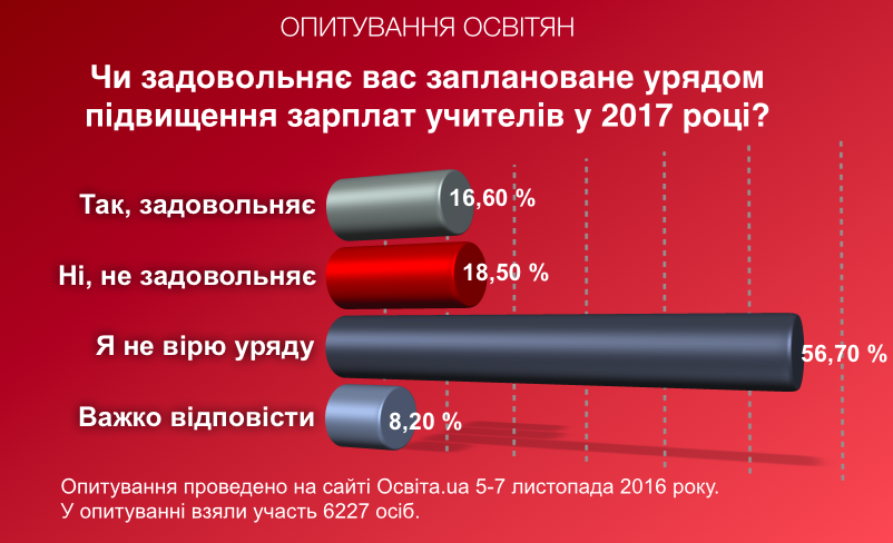 Инициатива правительства по повышению уровня заработной платы учителей украинских школ не вызывала значительной поддержки у педагогов. Об этом свидетельствуют результаты онлайн опроса, проведенного Освіта.ua.