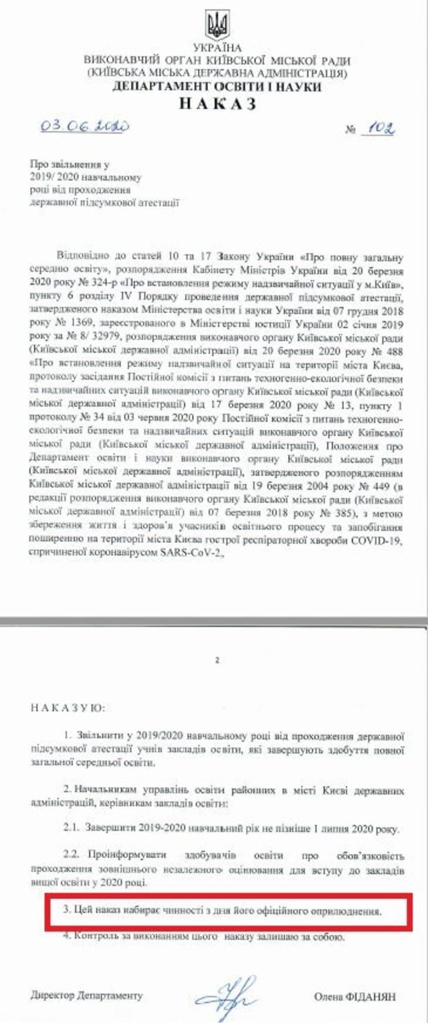 Як відомо, Міністерство освіти і науки 3 червня поширило заяву про те, що наказ очільниці освітнього департаменту столиці Олени Фіданян є нечинним і не підлягає виконанню.