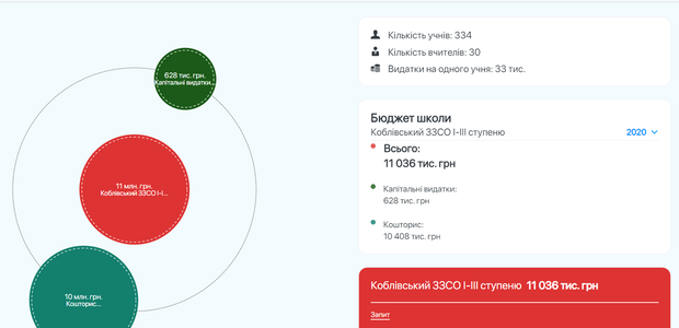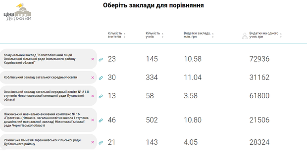 CASE Украина, кроме отдельных бюджетов школ, запустил онлайн-платформу, благодаря которой родители могут сравнить показатели своей школы - количество учеников, количество учителей, общие расходы, расходы на одного ученика - с любыми другими учреждениями ОТГ, региона и Украины в целом. Например, с помощью инструмента можно узнать, что в Коблевском заведении общего среднего образования (Коблевская ОТГ, Николаевская обл.) 30 учителей учит 334 детей, на что имеют финансирование в этом году в размере 11 млн грн или 31,5 тыс. грн на одного ученика. А в Капитоловском лицее Оскольской ОТГ (Харьковская область) всего 23 учителя обучают 145 учеников, на что тратится 10.6 млн грн налогоплательщиков, или 72,9 тыс. грн на одного ученика.