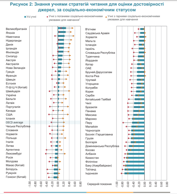 Учні з благополучного соціально-економічного середовища в усіх країнах-учасницях та економіках, що брали участь у PISA-2018, отримали вищу кількість балів в індексі знань про стратегії читання для оцінки надійності джерел, ніж учні з неблагополучного соціально-економічного середовища.