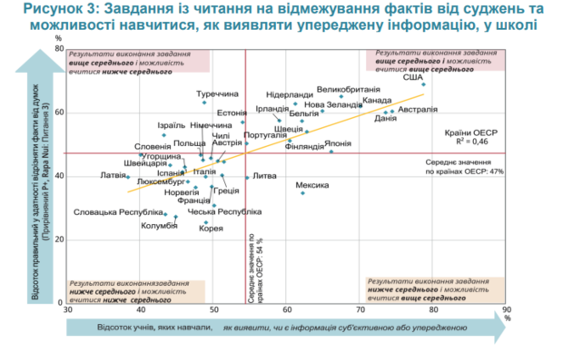 Дані PISA-2018 показують, що можливість учнів навчитися виявляти суб’єктивну чи упереджену інформацію в школі тісно пов’язана із розрахованим відсотком правильності в пункті, який зосереджується на відмежуванні фактів від думок в оцінюванні PISA з читання (R2 = 0,46) у країнах ОЕСР.